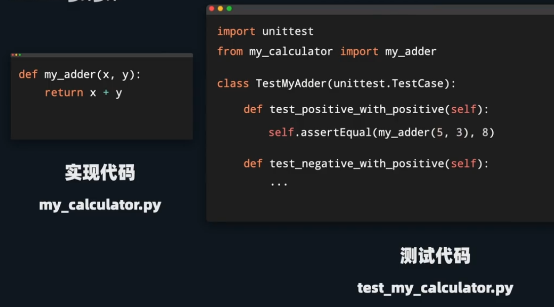 1 2 3 4 5 6 7 8 9 10 11 import unittest:from {同目录下被测试文件名} import {被测试文件类名}class {自定义类名} (unittest.TestCase): def setUp (self ): self .{自定义属性}={被测试文件类名}({被传入的数据}) def {"test_" 开头的方法名} (self ): self .{assertEqual等}(参数1 ,参数2 ) def ...