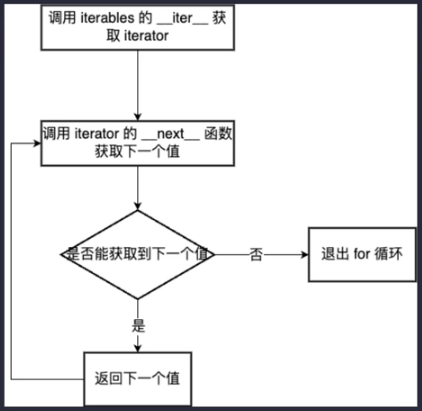 iter(可迭代对象)/__iter__(迭代器)–>返回一个迭代器next(迭代器)/__next__(迭代器)–>依次返回下一个值
